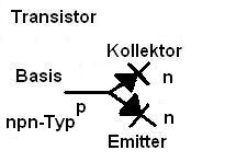also pn bei npn-Typen. Die Basis-Emitterstrecke kann man sich als Diode vorstellen, deren Pfeil im Schaltbild die Durchlassrichtung zeigt. Also bei pn (positiv