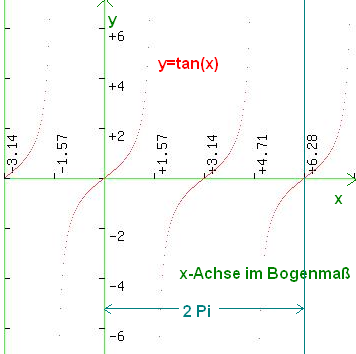 Die Tangens-Funktion gehört zu den trigonometrischen Funktionen. Ihre Definition kann am Einheitskreis nachvollzogen werden. In der Abbildung ist eine Periode entsprechend 2*Pi auf der X-Achse besonders gekennzeichnet. Da Tangens als Quotient aus Sinus und Cosinus definiert ist, ist bei Division durch Null (Nulldurchgang der cosinus-Kurve) ein gegen unendlich strebender Grenzwert zu beachten, während die Nulldurchgänge den Nulldurchgängen der sinus-Funktion entsprechen. Auch der Tangens ist eine periodische Funktion!Die Tangensfunktion ist bei Wikipedia entsprechend erklärt. Hier erfolgt eine Animation im Einheitskreis.